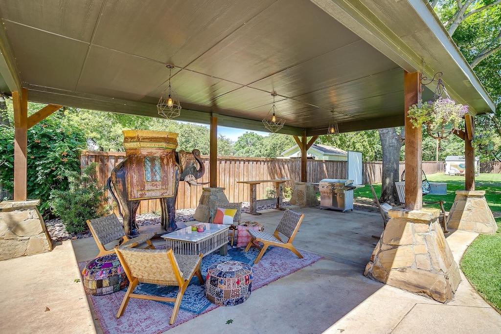 3 Bedrooms • 2 Bathrooms 2 Baths • Sleeps 8-10Welcome to the Bougie Bungalow in the heart of DFW! Bursting with unique touches sourced from around the world, this 3 bedroom / 2 bath home is tucked back on a 1 acre corner lot full of large trees and lush landscape. This home has been impeccably remodeled - each space creatively and professionally designed.